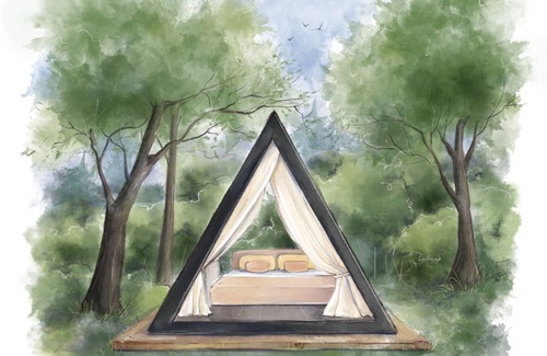 Enjoy the simplicity and elegance of a cozy bedroom in the woods. These compact, yet luxurious a-frames are designed to provide unparalleled comfort. The Hideaway Hut offers a queen size bed with luxury linens and a private firepit area in the perfect setting for a relaxing outdoor experience. Perfect for solo travelers, couples and group getaways. The cabins are thoughtfully situated, ensuring a 2-5 minute stroll to a state-of-the-art, climate-controlled bathhouse offering hot showers, premium toiletries, and a sophisticated design for your convenience.