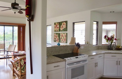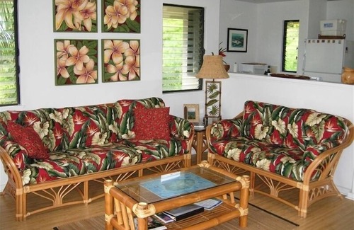 Haleakamanu is a two story, free standing home that has been recently renovated with bamboo floors upstairs and new carpeting downstairs. It has been decorated with attention to tropical-style furniture and Hawaiian details. Upstairs is the living area; with a spacious living room, entertainment center and sliding doors to the lanai. Adjacent to the living room is the kitchen and the dining area and both are also open to the wonderful views. Enjoy creating fine culinary delights in the well appointed kitchen. It's well stocked, and ready for your use. Also located upstairs, is a convenient ½-bath and desk with phone and internet access. Downstairs you will find the bedrooms, the remaining baths and the laundry. The large master bedroom suite is comfortably equipped with a queen size bed, dressing alcove and closet, with a full bath and its’ own lanai. It has its’ own TV and telephone. The second bedroom is perfect for additional guests or additional family members, it has two twin beds and an adjacent bathroom with shower. The décor complements the lush garden surroundings. The outside is brought inside by copious windows – on both floors. The windows (forty-two and counting) are open to the light, surrounding views and cool tropical breezes. Both of the bedrooms and the living room have ceiling fans.