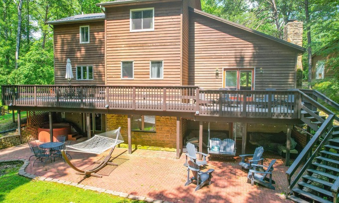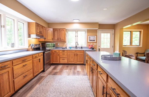 The Ridge also has an open and airy downstairs space for movie nights, with two additional bedrooms equipped with queen-sized beds, a complete bathroom, and a shower. Enjoy the magnificent views of the woods from the enormous elevated wraparound deck while sipping coffee. Come and indulge in the beauty of nature with your family or loved ones.