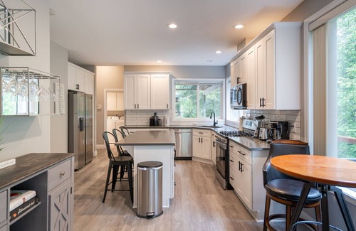 We have a bar counter and a round pub table for a couple to enjoy a beverage or quiet conversation while looking out the window to the greenery.