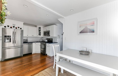 Outdoor amenities include an outdoor shower for rinsing off after the beach, back porch w/seating, and front patio area w/grill and picnic table to enjoy lunch/dinner outside. The quiet, family-oriented street only allows vehicle traffic for loading/unloading.