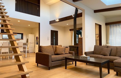 Located in a calm and quiet area From the road you can take a dedicated approach and park your car next to the villa some stairs are available The building is twostory and features a wooden deck with a roof that surrounds the villa On the first floor there is a 25 tatami living room with an atrium a dining room a 6 tatami bedroom 1 queen bed a jacuzzi bathroom a sink and a toilet The second floor of the loft type room is a 105 tatami bedro