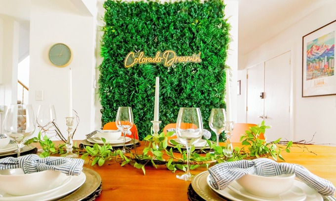 The kitchen space transitions into a trendy, Denver-inspired dining area with an expansive dining table designed to accommodate 8-10. A fun, custom greenery wall with a neon accent sign provides a stylish atmosphere and unique insta-worthy photo op.