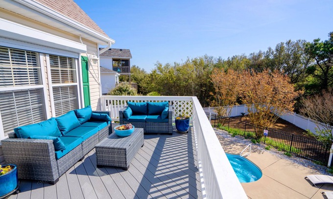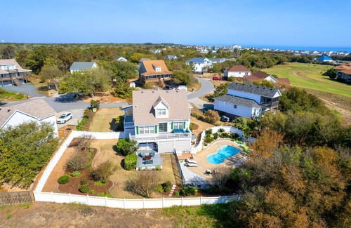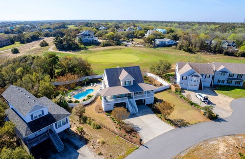 Welcome to Buck's Pirate Cove! Located alongside the 18th green of Seascape Golf Course, this 3-bedroom home offers a perfect coastal lifestyle for golfers and beach-goers alike. The spacious and brightly designed living areas are perfect for entertaining guests or relaxing with family. Enjoy a private top floor King suite, a saltwater pool and hot tub, beautiful views of the golf course, an outdoor gas firepit, and a short drive to the closest Kitty Hawk public beach access.