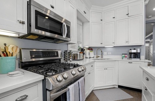 We have a fully stocked kitchen. We provide salt, pepper, olive oil and sugar. Cookware, bakeware, plates, cups, and utensils. Appliance list include: microwave, Keurig that allows for k-cups and filtered coffee, electric kettle for hot water, blender and toaster. If you have any questions about what we supply, please let us know.