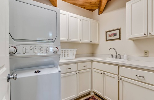 Laundry room with stacked washer/dryer and sink.