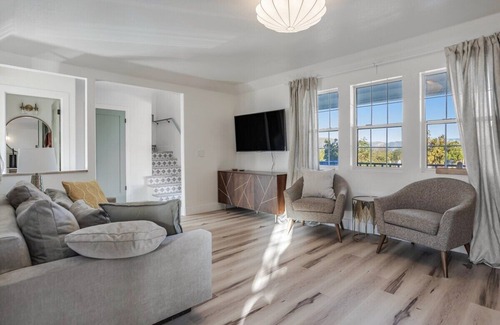 In the Main House, the bottom floor is for socializing with a plush living room, a new kitchen with a professional 48-inch stove, and a large dining area. There is a fully stocked tea bar and espresso machine. A beautiful bathroom conveniently located just as you come in from the pool welcomes you to shower easily after a swim. The laundry is also on the main floor.