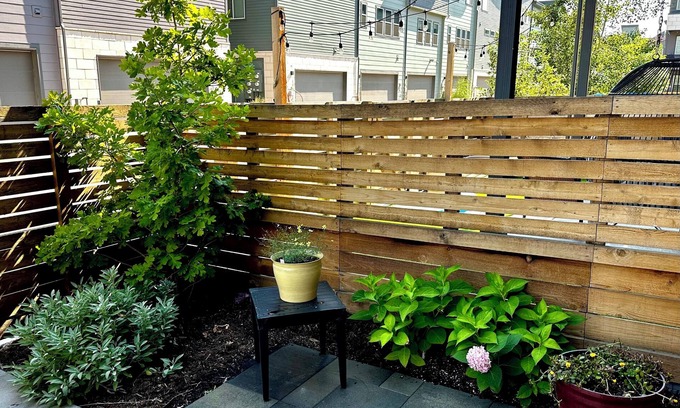 The private, fenced back yard has a bistro set and string lights that give the patio extra ambiance in the evenings. The landscaping has an automatic watering system so you can enjoy the greenery without lifting a finger! There is also a motion-activated camera (we can access this but it only points to the back gate).