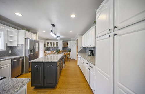 The main level offers a spacious living room featuring a 55-inch Smart TV, an updated full-function kitchen, and dining space for up to 20. With all the amenities, including stainless appliances, granite counter tops, a large island, and three dining tables, the eat-in kitchen and dining area offer plenty of space to create and enjoy meals together. Kitchen and indoor dining spill out onto an expansive, multi-tiered outdoor deck with abundant seating for even more relaxation and dining. The deck, and most of the upstairs windows, overlook gorgeous views of the private lake and open hillside surrounded by towering pines.