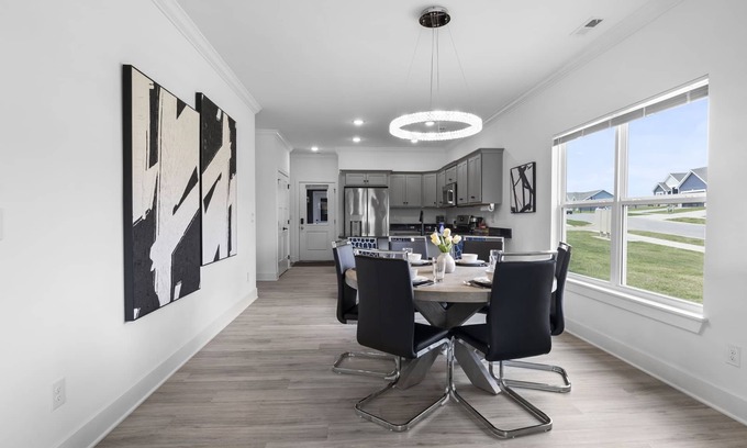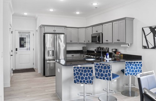 Upon entering through the front door, you'll arrive in the open-concept living area, which includes a comfortable living room, dining area and spacious kitchen - perfect for spending time with your whole group, whatever the activity. Enjoy a spacious sofa and accent chair with a mounted TV above. The dining space has a table for 6 and the kitchen is fully equipped and designed with modern conveniences.