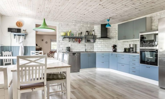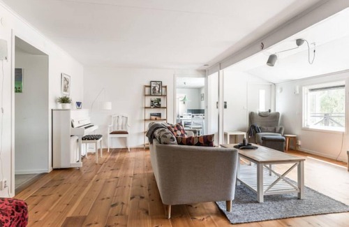 "Erikstorp Villan", 6-room house 150 m2. Object suitable for 10 adults. Bright, renovated in 2015, beautiful and cosy furnishings: living room with Scandinavian wood stove, satellite TV and CD-player. Exit to the veranda. Living room with winter garden with satellite TV. Exit to the veranda. 1 room with winter garden with 2 beds. 1 room with winter garden with 1 double bed. 1 room with winter garden with 2 beds. 1 room with 2 beds. 1 room with 1 double bed. Living room with dining table. Open kitchen (oven, dishwasher, 4 ceramic glass hob hotplates, microwave, freezer, electric coffee machine) with dining nook. 2 showers/WC. Electric heating, underfloor heating. Wooden floors. View of the lake. Facilities: washing machine, iron, children's high chair, baby cot. Please note: non-smokers only.