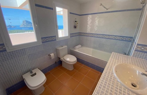 The house has three floors, on the first floor and as we access from the outside there is a living room with TV, and exit to the terrace and beautiful views of the sea and the rock of Es Vedra, kitchen with access to the terrace, toilet, bedroom with two beds with en suite bathroom with shower.