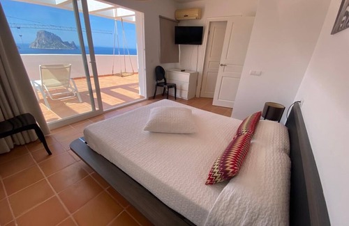 The upper floor has a bedroom with double bed with en suite bathroom and access to the large private terrace with beautiful views of the sea and the islet of Es Vedra.