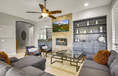 Indoors: The interior of this single-story home is 2,667 square feet. The great room features seating for 6-8, a fireplace, a 65-inch HDTV, and a wet bar.