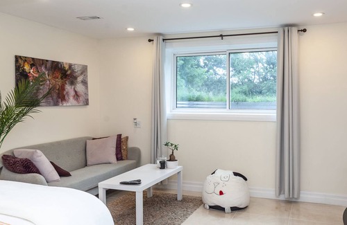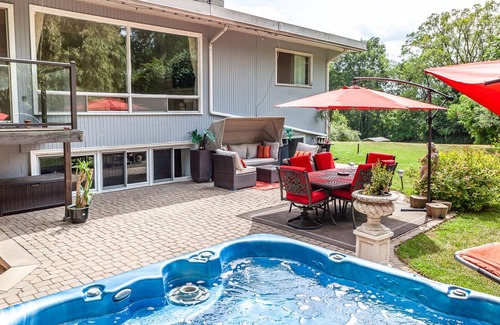 Short walk to Webster's and Tew' Falls, Dundas Valley Peak, Crooks Hollow and so much more! See if you can spot the blue jays, red cardinals, hawks, and deer. Forested shared backyard for romantic date or outside events. Outdoor fire pit, huge patio, hot tub, gym room.
