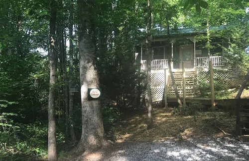 Experience a peaceful and relaxing getaway at the Serenity Cottage - a cozy studio cabin nestled by the brook with no steps to worry about. This cabin boasts a fully equipped kitchenette and a comfortable queen bed with two recliners & a big screen TV. Enjoy the ambiance of the wood-burning fireplace, while the modern HVAC system keeps the cabin perfectly comfortable throughout the year. Pet-friendly accommodations are available upon host approval and following the pet policy. Decorated in tranquil greens and greys, the Serenity Cottage is perfect for those who want to unwind amidst the beauty of nature. With just three steps up the porch, it is our easiest cabin to access. Savor your morning coffee or favorite afternoon beverage on the covered front porch while watching the ducks frolic in the brook/pond.