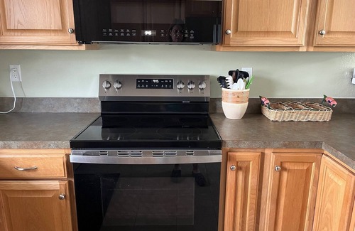 Kitchen: Fully equipped with new Stainless Steel appliances; Dishes and utensils, cookware, glassware, small appliances, refrigerator with water/ice maker, stove, microwave, coffee maker, Keurig, blender, kitchen towels and hot pads