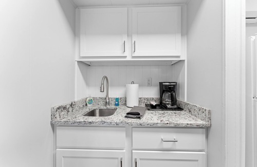 This cozy studio near Table Rock Lake is the perfect place for a quick getaway. The open concept layout features a King size bed, and comfortable bedding. A quaint dining area to enjoy your morning coffee. A kitchenette complete with refridgerator, sink, microwave, and full size coffee maker. The bathroom features a walk-in shower, with fresh linens, and complimentary toilteries to get you started on your trip.