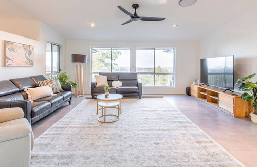 Unwind with your entire family or a large group of friends at our serene hinterland retreat. Positioned on top of a hill in Bli Bli, this home boasts an expansive wrap-around deck, with panoramic views stretching from Maroochydore to Peregian Beach. As you step inside you’re greeted with a sitting area and a spacious living area with a beautiful view as its backdrop. The living area features a plush lounge and smart TV (FTA & apps) to relax and unwind on holidays.