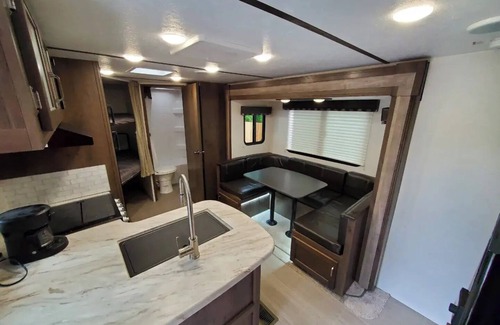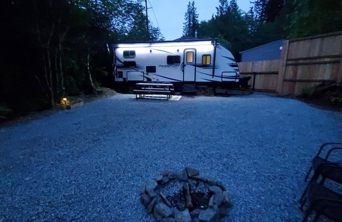 New VRBO! Private campsite nestled in the woods with your own camper. Located just off I-5 (no freeway noise) near the Galbraith Mountain trailhead parking lot (5 minute bike ride). Nestled between Lake Padden and Samish. Only 15 minutes from Belllingham. A fully functional camper; kitchen, full bathroom, bedroom with new queen bed, double bunks, A/C and an outdoor kitchen under a covered electric awning. Outside guests enjoy nature and privacy in fenced area with firepit and seating.