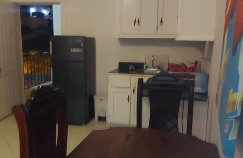 The kitchen is equipped with a refrigerator, as well as a microwave, cookware, and a coffee grinder. Enjoy the free WiFi and LED TV. You can also use the rainfall showerhead, plus other bathroom amenities like towels. And there is a laundromat nearby so you can pack a bit lighter.