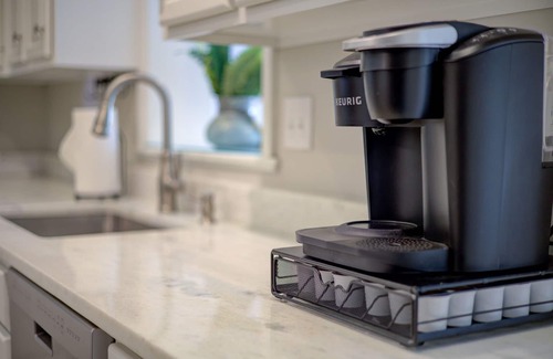 Adjacent to the sitting area, you'll find a stylish dining table that comfortably accommodates six people. Situated conveniently next to the dining area is the modern white kitchen, equipped with a gas and electric stovetop, oven, microwave, dishwasher, and a handy Keurig machine. The cabinets are fully stocked with all the essentials, ensuring you have everything you need to prepare delicious meals during your stay.