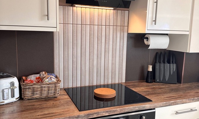 While you're here, you can enjoy all the comforts of home and more, including a soaking tub and a refrigerator, as well as an oven and a stovetop. Other amenities include towels, an electric kettle, a toaster, and an ironing board.