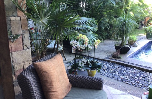 Wonderful condo with walk out to private pool, BBQ, palapa, outdoor dinning area and gardens, first bedroom (matrimonial bed) with on suite, second bedroom (2 single beds) both have air conditioning and a main bathroom . Full kitchen with ice maker plus washer and dryer. Telephone with unlimited calls to the US and Canada.