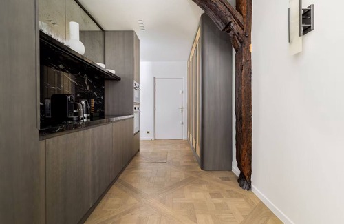 If you're heading to Saint-Germain-des-Prés, this apartment is ideally placed. It’s on the ground floor of a quiet courtyard, so you get a peaceful spot despite being in the heart of the city. Inside, everything from wooden beams to Versailles parquet floors and high ceilings really give it that classic Parisian feel.