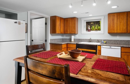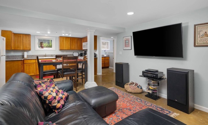 Fully finished basement area with epoxy-sealed concrete floors, new windows that provide plenty of natural light, and granite countertops. Queen bed. Enjoy the gas stove that both warms the area and adds ambiance. A full kitchen with an electric range, microwave, and refrigerator makes meals easy. There is a washer/dryer in the unit for your use. Stereo and TV are provided. Outside is a relaxing garden area. Guests feel at home in this space.