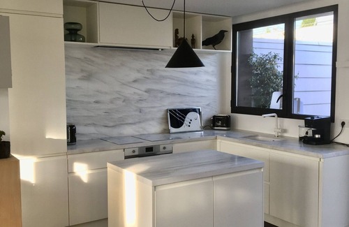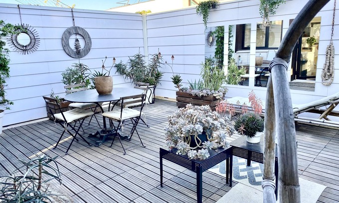 Vous pourrez profiter de l'espace de vie ( cuisine salle à manger et salon en open Space ) et de la grande terrasse très calme de 30 m2 équipée d'un store électrique. TV, wifi, enceinte musicale climatisation et parking privé vous attendent. L'appartement est un duplex neuf entièrement équipé. Vous cohabiterez avec un mobilier luxueux et contemporain pour vous ressourcer et passer un séjour dans le calme et la sérenité.