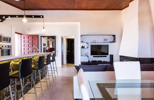 Entering the villa there is a spacious open plan area consisting of the fully equipped kitchen with a dining table and the living room with a large sofa, a fireplace, a 50" satellite HDTV and Playstation 4. The area opens to a balcony which offers the excellent sea view. As you go through the hall way there are 4 bedrooms with 32" HDTV and the main bathroom with shower. Three of the bedrooms have a double bed and the other one has 2 single beds which can also be transformed to a double one. One of the bedrooms has an en-suite bathroom with shower.