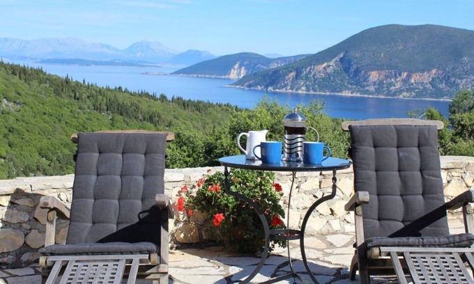 The living room and bedrooms all open onto a large terrace that commands breathtaking views over the nearby island of Ithaca and Lefkada, with the mainland mountains of Epiros in the distance.