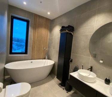 Exclusive Modern Villa with a great view! is a sustainable villa in Asker, 16 miles from Oslo Central Station. This property encourages guests to embrace nature with its eco-friendly arrangements. This property offers access to a terrace and free private parking. The accommodation provides luggage storage space and private check-in and check-out for guests. With free Wifi, this 4-bedroom villa features a flat-screen TV, a washing machine, and a fully equipped kitchen with a dishwasher and oven. The air-conditioned unit at the property features a hot tub and a dressing room. For added privacy, the accommodation has a private entrance and soundproofing. A mini-market is available at the villa. The area is popular for walking tours and bike tours, and car rental is available at the villa. An indoor play area is also available at Exclusive Modern Villa with a great view!, while guests can also relax in the garden. Akershus Fortress is 16 miles from the accommodation, while Sognsvann Lake is 17 miles from the property. The nearest airport is Oslo Airport, 45 miles from Exclusive Modern Villa with a great view!.