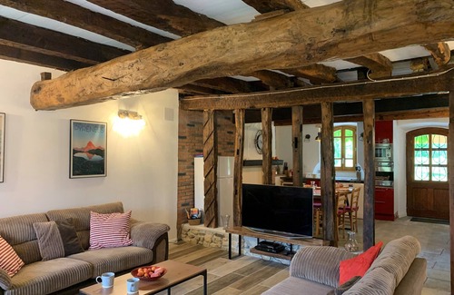 An entirely renovated gite which retains many of the original features from when the building was a farm house. The accommodation, 91.2m2 is made of a large open plan living area with a generous lounge and kitchen separated by colombage. Alongside a well equipped kitchen there is a shaded terrace, summer kitchen in the adjacent barn and garden with a heated swimming pool. A comfortable living room equipped with a smart TV and a wood burning stove. There is also a downstairs toilet with a washing machine.