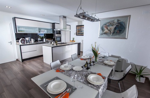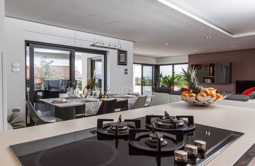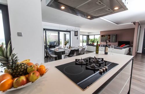 In the famous resort of Crikvenica, in a quiet location, this luxury holiday home. The spacious and modern house is fully air conditioned and equipped with the latest trend. On the ground floor is the living room with kitchen and dining room and the first floor are the bedrooms. From the floor there is access to the terrace at the back of the house. It is covered with plants and an oasis of nature. From the living room you reach the covered terrace with stunning views of the sea. In the hot summer months, cool off in the swimming pool. This holiday is designed faithfully to your needs and offers you a pleasant holiday. Take part in the entertaining and cultural recreational facilities or the sports activities in Crikvenica. This place is known for its beautiful beaches and the beautiful sandy beach there are plenty of recreational opportunities, especially for young children.