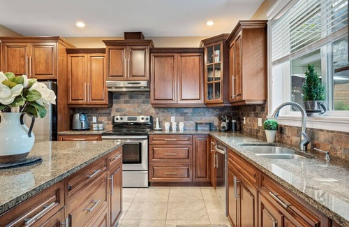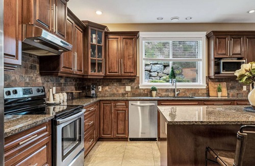 This family home has a fully equipped kitchen, eating nook, and a formal dining room. The glass door just off the kitchen leads to a patio that also offers outdoor seating, a BBQ, and a covered eating area.