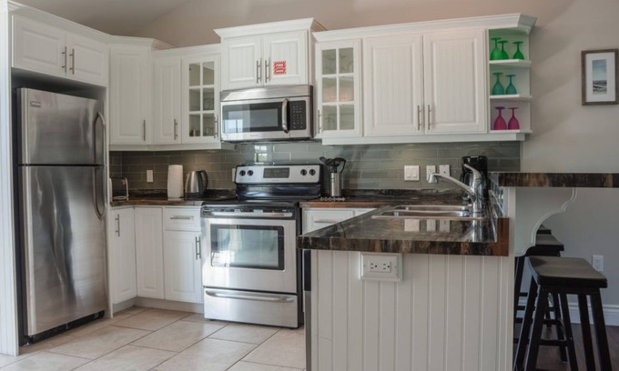 Our Ocean Drive Executive Suites offer a living/dining/kitchen open concept design featuring vaulted ceilings with sliding patio doors providing access to back deck with overview of one of PEI’s most popular golf course. These Suites are comfortably heated and climate controlled with energy efficient in-floor heating, and wall mounted Heat pump/AC. Kitchen is generous in size boasting loads of white cabinetry, stainless steel appliances, and a handy built in breakfast bar. The primary king suite has a large walk through closet to the primary ensuite with double vanity and sliding patio doors to the back deck. Second bedroom features two twin beds, cable TV and sliding patio doors to back deck and there is a third bedroom with a Queen bed and a massive walk-in closet. Second Bathroom includes a washer/dryer.