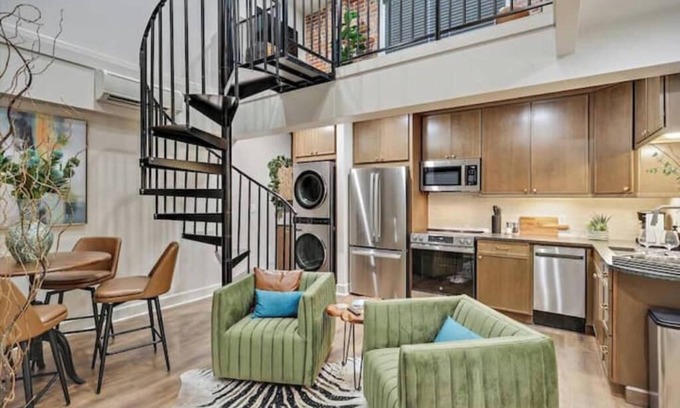 This industrial loft apartment has an open layout, two floors, and has spiral stairs.