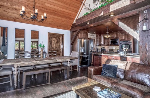 The rushing sounds of Ute Creek greet you at the front door, and the main-level deck presents beautiful views from every angle of the house. A wide-open, fully equipped kitchen with double convection ovens makes cooking for large groups incredibly easy.