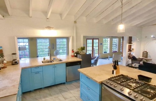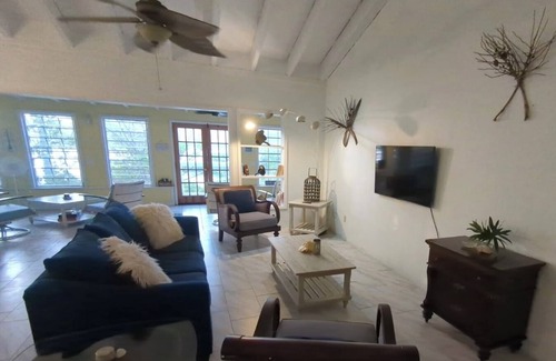Imagine the Caribbean 50 years ago before chain hotels and condo developments when you could stroll to the beach or explore a relatively undeveloped island on golf cart. It exists today and it’s just a 10 minute passenger ferry ride from bustling Saint Thomas. Now picture yourself heading down to Honeymoon Beach (just a 5 minute walk from the house) to chill under a palm. If you get restless, there is everything from snorkeling to pickle ball to volleyball anchored by the famous “Dingy’s Beach Bar.” You may even catch a band Sunday afternoon. Rent a golf cart and head to Heidi’s on the hill top for amazing fish tacos. Explore other beaches on the island, an abandoned fort with tunnels and turrets then pick up some necessity groceries at WI mart and shop a cute art shop with a kid friendly icy/drink stand. Need to return to reality - explore Saint Thomas by day and retreat back to our quiet 500 acre island at night. This home is “old school” and is part of a 4 unit semi-attached compound and should not be considered a luxury accommodation. We have been rehabilitating the property for a year with many projects in the works and have made it comfortable for our family but it may not meet your vacation standards. Keep in mind the air conditioning is only in the bedrooms.