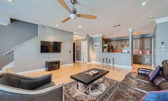 Living Room: The cozy and comfortable living room offers a plush sofa and armchairs as well as a Smart TV for streaming your favorite shows, perfect for relaxing after a long day of exploring the vibrant city of Austin.