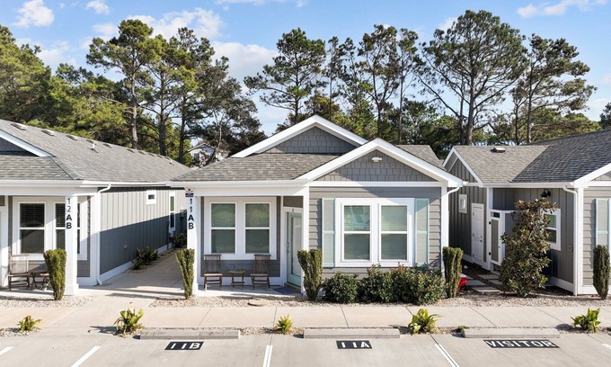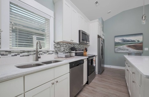 Inside Victoria's Corner, you'll be welcomed by a beautifully decorated living and kitchen area. With plenty of seating and a flat-screen TV, the living area is an ideal space to gather with family and friends. Wanting to prepare meals during your stay? No problem! With plenty of counter space and stainless steel appliances, the chef in your family can easily whip up something tasty. The breakfast bar seats 6 comfortably so everyone can dine together. You can also take advantage of the Keurig coffee maker and step out onto the back patio to enjoy your morning coffee. Both bedrooms at Victoria's Corner feature private bathrooms for your convenience, making it the perfect space to relax, unwind, and get much-needed R&R during your stay. Additional amenities at Victoria's Corner include a gas grill, grass volleyball court access, outdoor shower, and WiFi internet access.