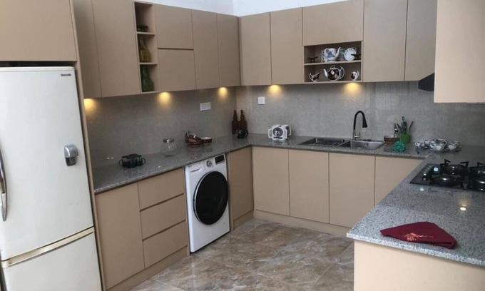 A modern kitchen outfitted with appliances like a refrigerator, stove, and washing machine, making it ideal for preparing meals with your loved ones.