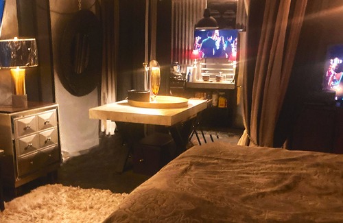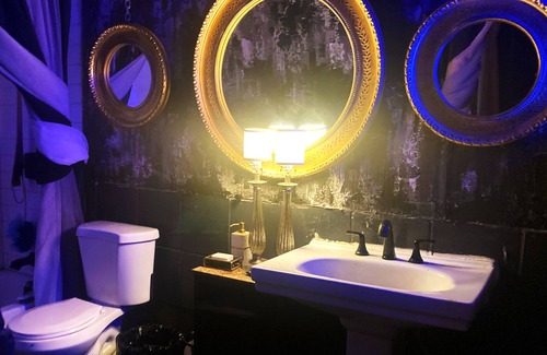 EXPERIENCE HOLLYWOOD IN THE PRIVATE HIDEAWAY OF THIS DESIGNERS SECRET HAVEN. THIS UNIQUE STUDIO STYLE CONDO WAS DESIGNED ESPECIALLY FOR THE COMFORT AND INSPIRATION FOR THE ARTIST THAT CREATED IT. NOW ALLOWING A FEW FASHIONABLE GUESTS TO EXPERIENCE HIS MULTI MEDIA STATE OF THE ART PRIVATE STUDIO. COMPLETE WITH ITS OWN PRIVATE GARDEN ONE OF THE ONLY ONES IN THE BUILDING. SMELL THE SCENT OF JASMINE WILL INTOXICATE YOU. IT IS OVER THE TOP AND DRAMATIC AND WILL TAKE YOU INTO ITS WORLD. ITS ABSURD AND DECADENT AS THE 4 FLAT SCREENS ARE SYNCED TO PLAY THE SAME MEDIA THROUGHOUT SO IF YOUR WATCHING A MOVIE OR TAKING A TUTORIAL NOT TO WORRY YOU CAN WALK AROUND COOK ETC AND NEVER MISS A SECOND OF YOUR PROGRAMMING
