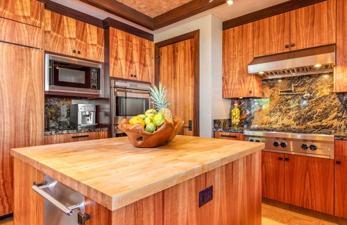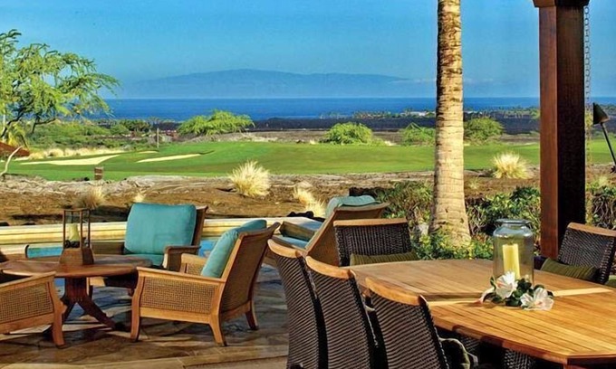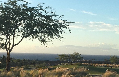 Enjoy breathtaking views of the Pacific Ocean, Haleakala on Maui, the Kohala mountains, and the 13th green of the Tom Weiskoph golf course. Privacy between the home and ohana (guest home) is achieved with a lush garden courtyard and lava rock walls.