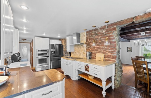 Step inside through the grand 4-foot-wide original front door and you’ll be transported into history—complete with hand-hewn beams, bluestone walls, and a vaulted foyer lit by chandelier. Curl up in the cozy living room around the pellet stove or enjoy movie night on the 55” Roku Smart TV. Host memorable dinners in the elegant formal dining room, or whip up meals in the gourmet kitchen with double oven & gas cooktop. Start your day in the sunny breakfast nook overlooking the lush grounds with fresh coffee & tea provided.