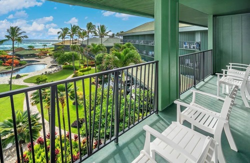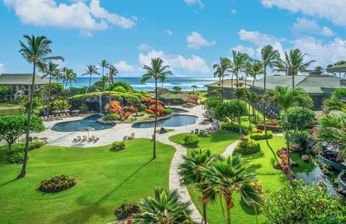We want to provide you with a complete island experience. Your cozy unit has a private lanai and furnishings drawn from Kauai's vibrant culture and history. Enjoy views together with first-rate amenities such as a sandy bottom oceanfront pool with pool bar, hot tubs, Pool Volleyball, waterfalls and a water slide!