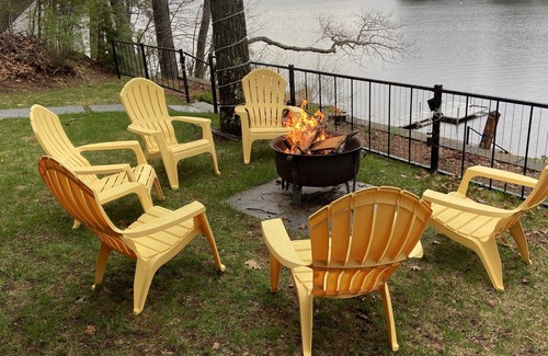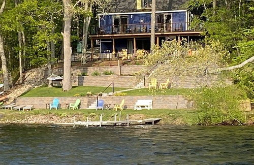 Book early. Pack your bags. Near the end of a mile long single lane dirt road(well maintained year round), you will find a secluded waterfront home situated in a quiet cove on coveted Square Pond (nearly 900 acres —5 miles of water)with expansive deck above a cascading, terraced lawn down to the waterfront. Crystal clear water for boating, swimming and fishing awaits. Sleeps 6 with two baths. Quiet and relaxing. Docks(2)and kayaks (4)and paddle boards available in the summer season. Modern home with WiFi and televisions. Forty steps from the water. Westerly view with afternoon sun. Sunsets!!