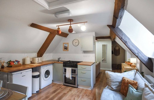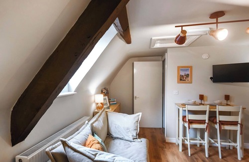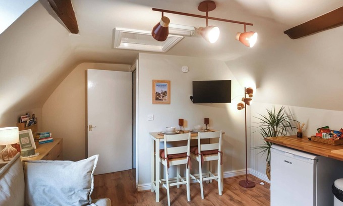 Bedroom area: Double (4ft 6in) Bed Ensuite: Cubicle Shower, Toilet. Gas central heating, gas, electricity, bed linen, towels and Wi-Fi included. Welcome pack. Public car park, at cost. No smoking. Please note: No children under 16 years old.. Tucked away in the heart of Bridgnorth, The Moorgate Loft offers an inviting and tastefully decorated retreat for your next getaway. This charming studio apartment is perfect for both work and pleasure, designed with a Scandinavian flair that creates a modern, airy atmosphere.